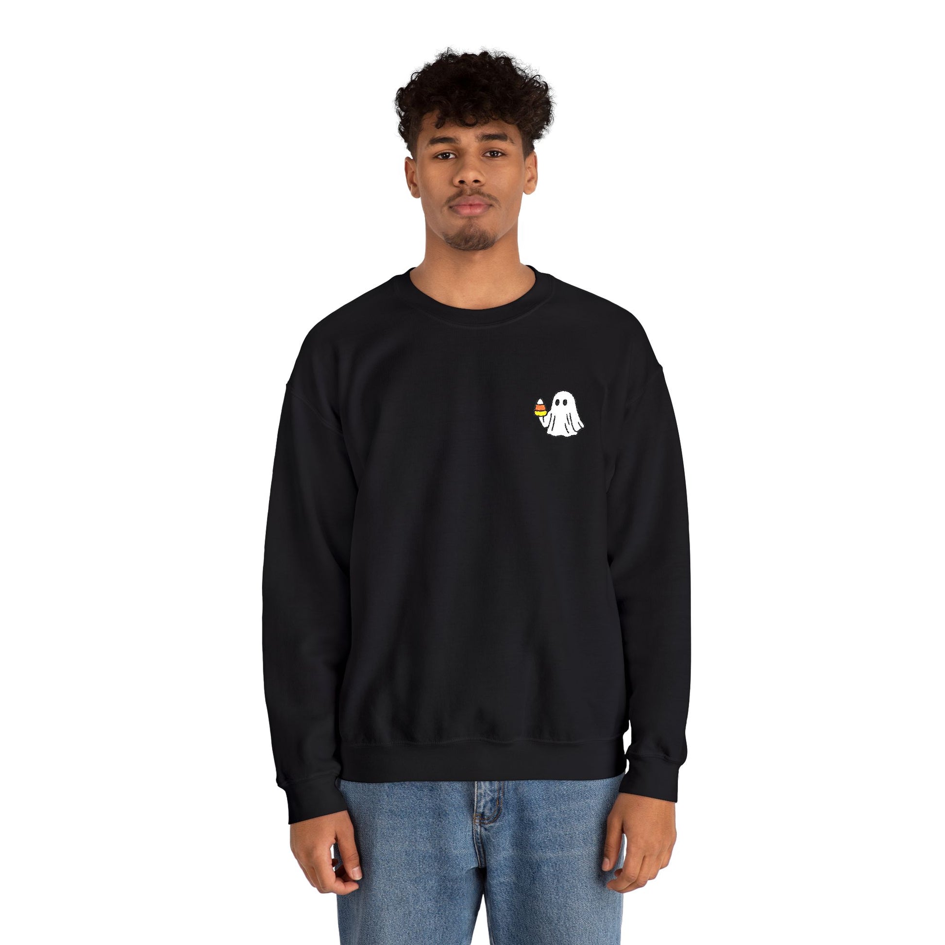 Stay cozy and cute with this embroidered Candy Corn Ghost Sweatshirt. Perfect for Halloween enthusiasts looking for a festive and comfortable piece to wear during the colder months.