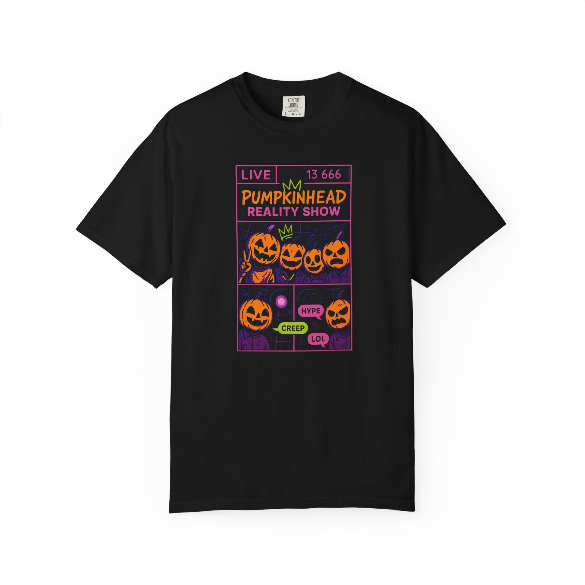 Satirical pumpkinhead livestream graphic: retro TV grain, bold contrast. Matte, long-wear print on tee — just made for you.