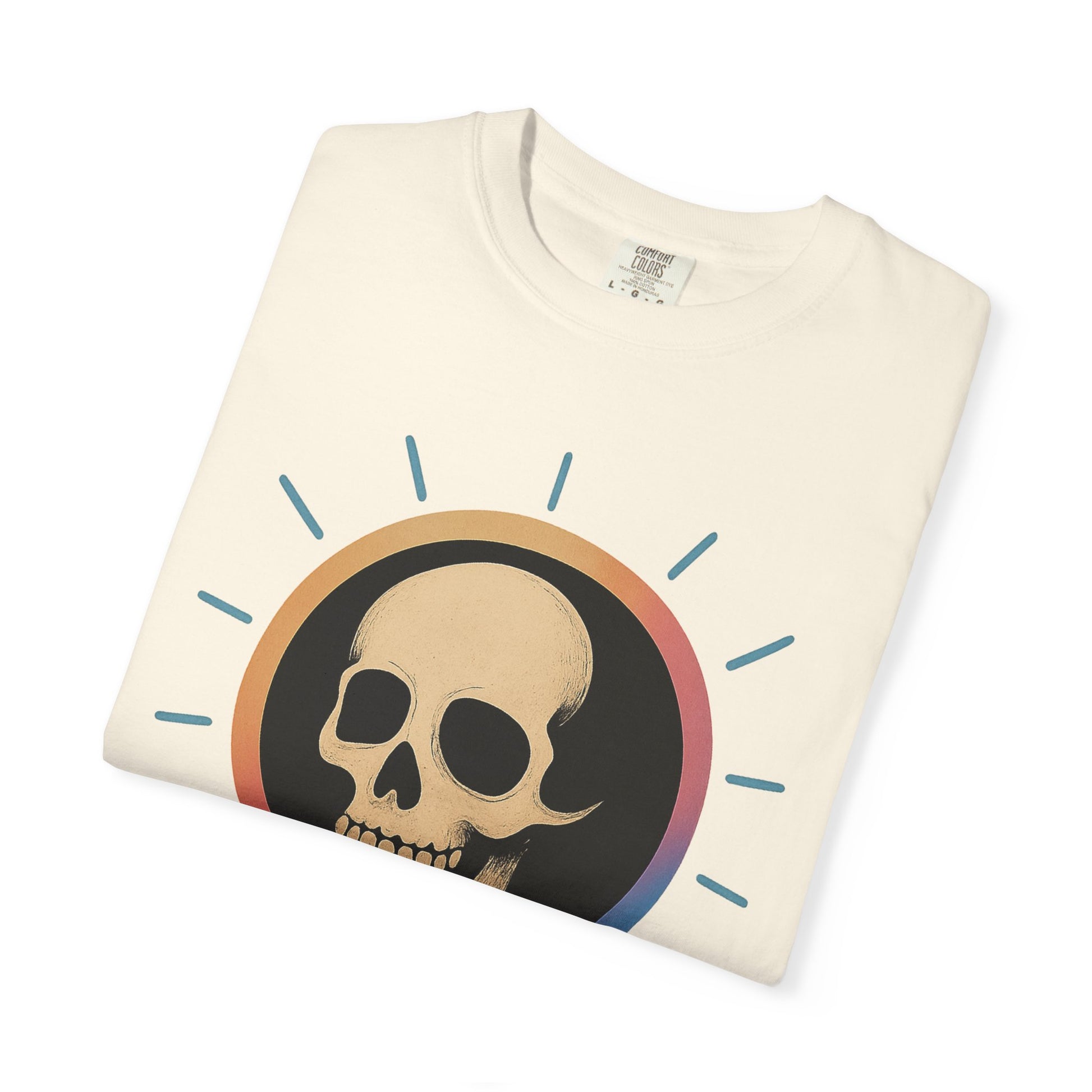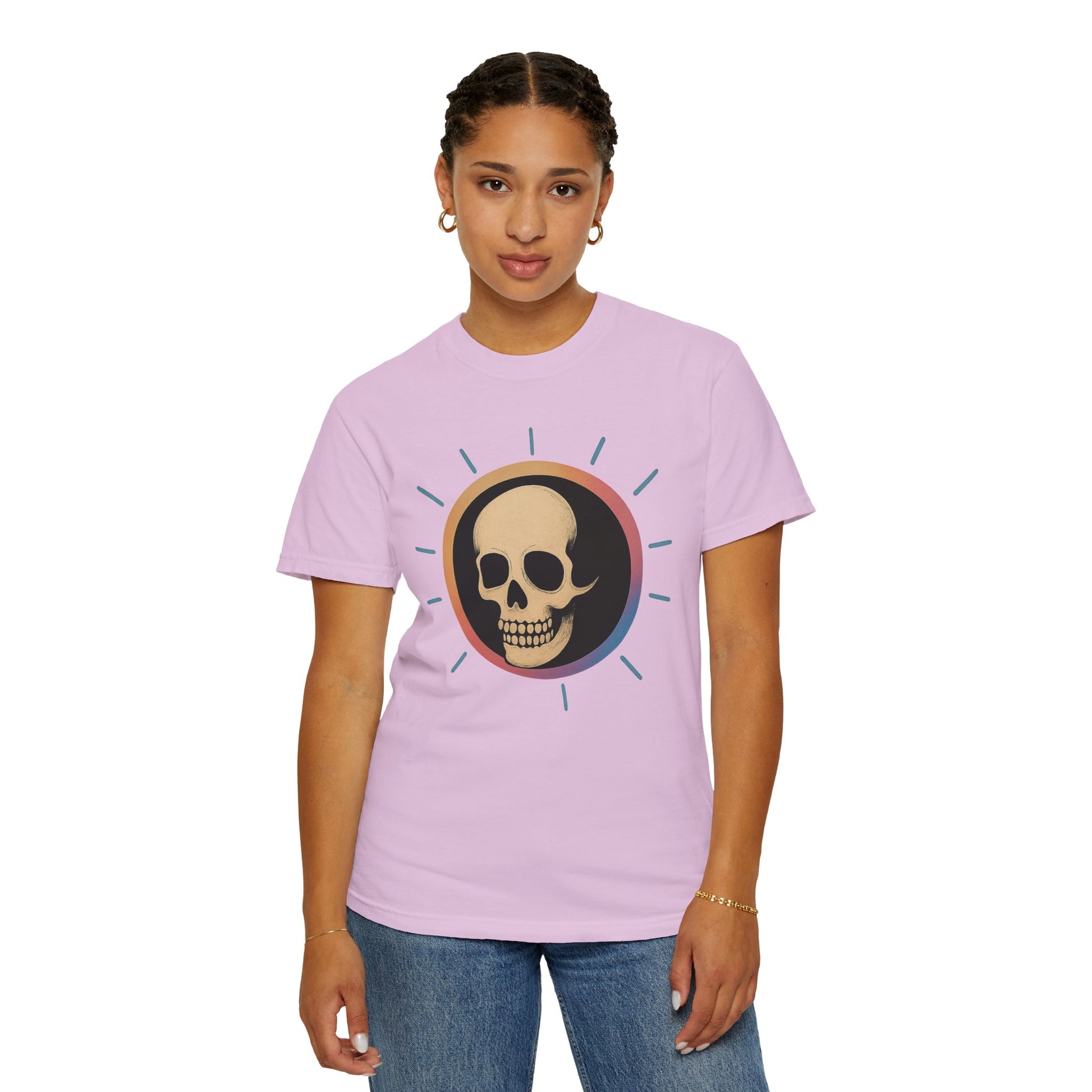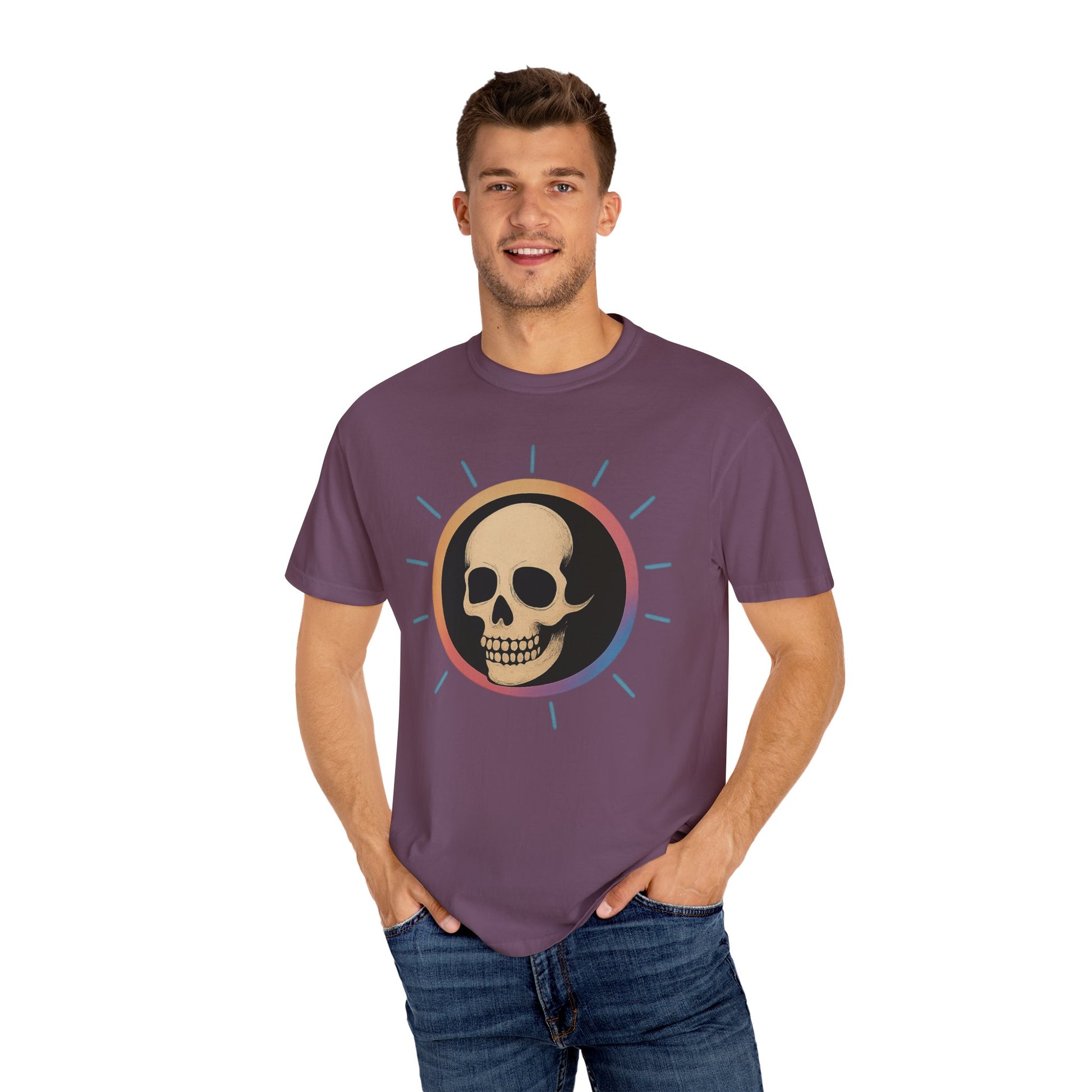 This Retro Halloween Skull T-Shirt is a cyberpunk neon graphic tee with a gothic vaporwave design, perfect for Halloween enthusiasts and streetwear fashion lovers.