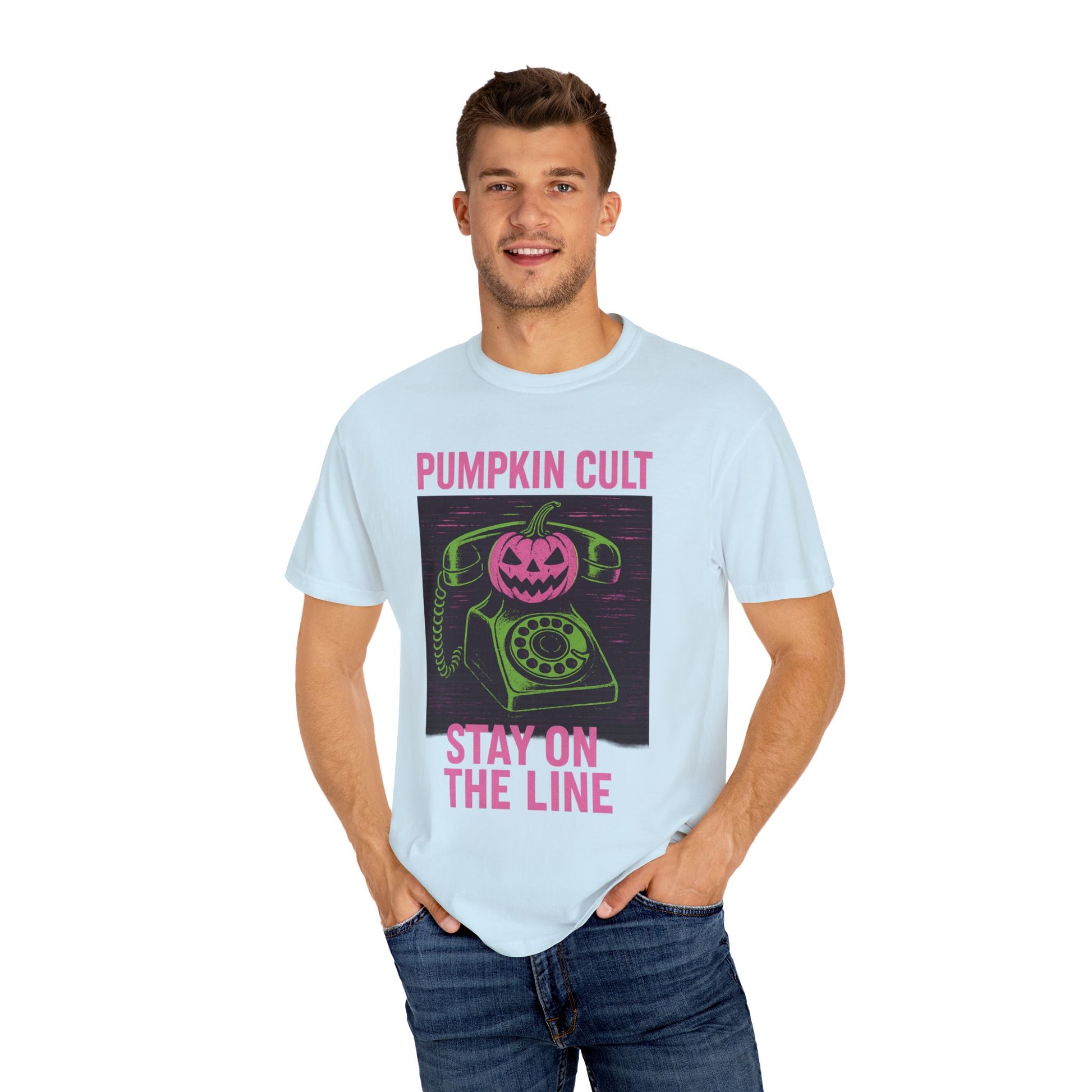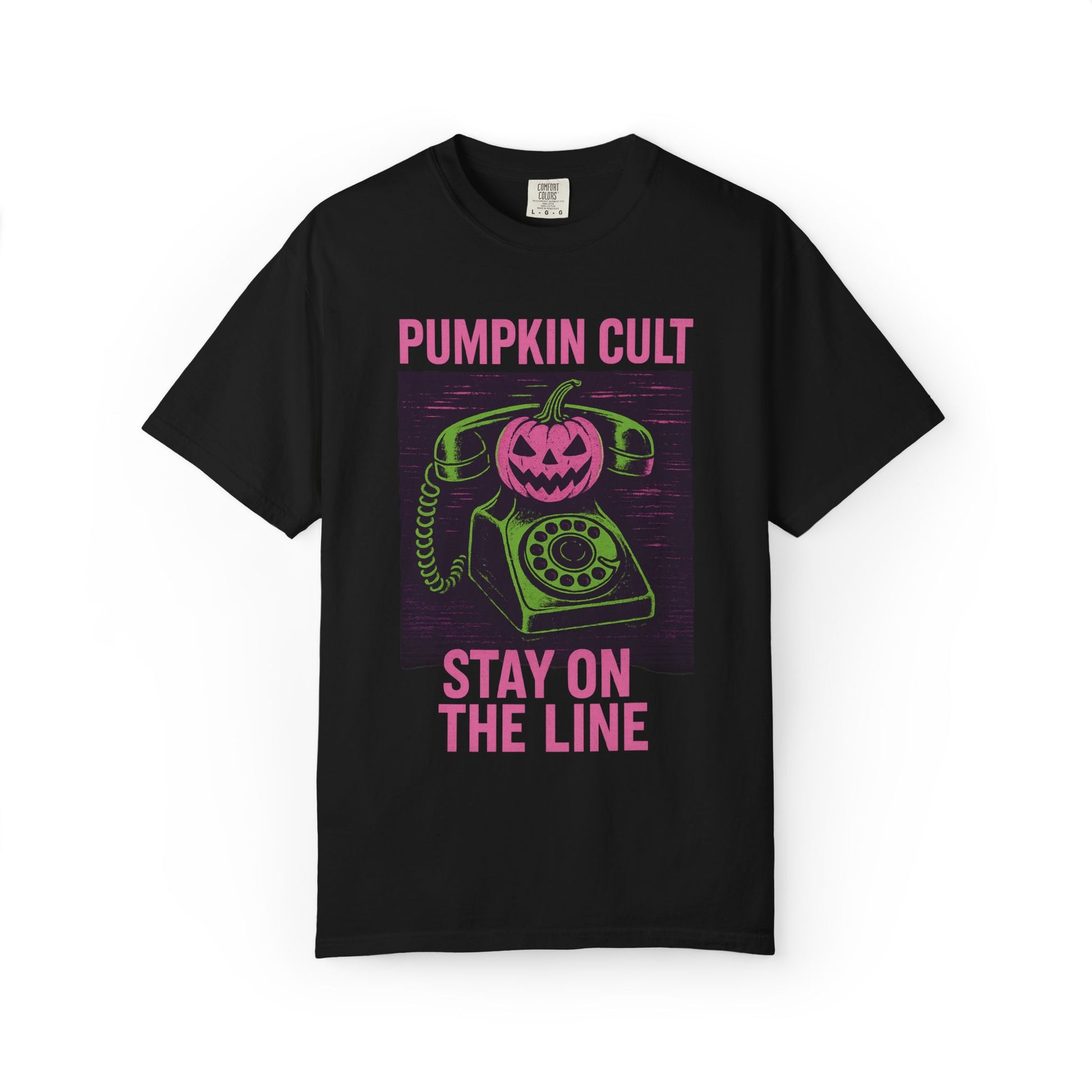 Creepy-cute pumpkin cult insignia, nostalgia-driven and highly wearable. Matte, crisp print on tee, made to order.